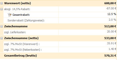 | Anpassung erfolgt + optische Aufwertung, da nur noch angezeigt wird was auch notwendig ist. Weiterhin werden die beim Kunden hinterlegten Nachkommastellen nun korrekt berücksichtigt und der Zusatzrabatt nach Zahlungsweise korrekt angezeigt. | |
